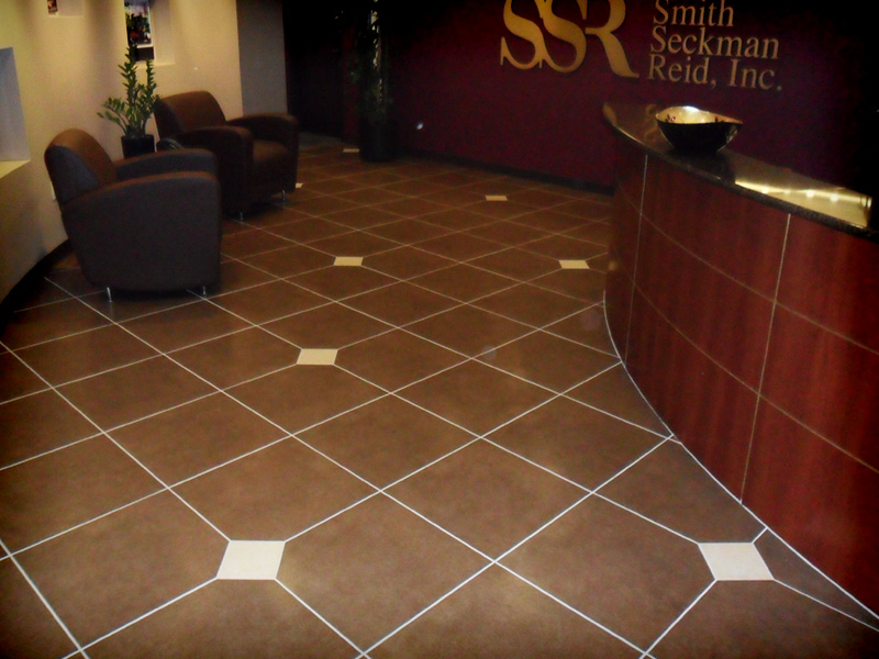 Comments: Floor is a 20″X20″ brown porcelain tile with 6″X6″ creme off-set decorative accents